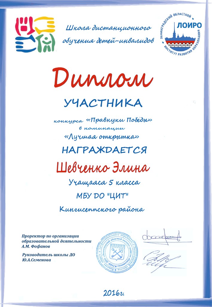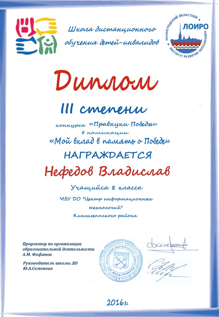 Подведены итоги дистанционного конкурса «Правнуки Победы», который проводит «Ресурсный центр дистанционного обучения детей-инвалидов Ленинградской области» http://rcdo47.ru