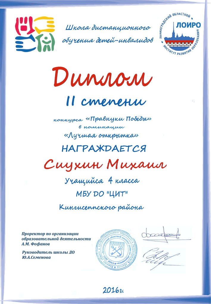 • Диплом 3 степени — Сиухин Михаил, педагог Казакова Л.А.
