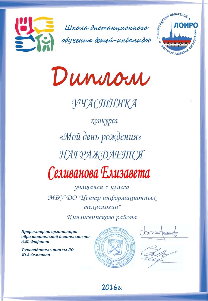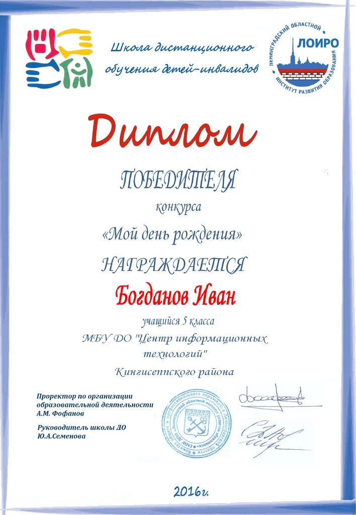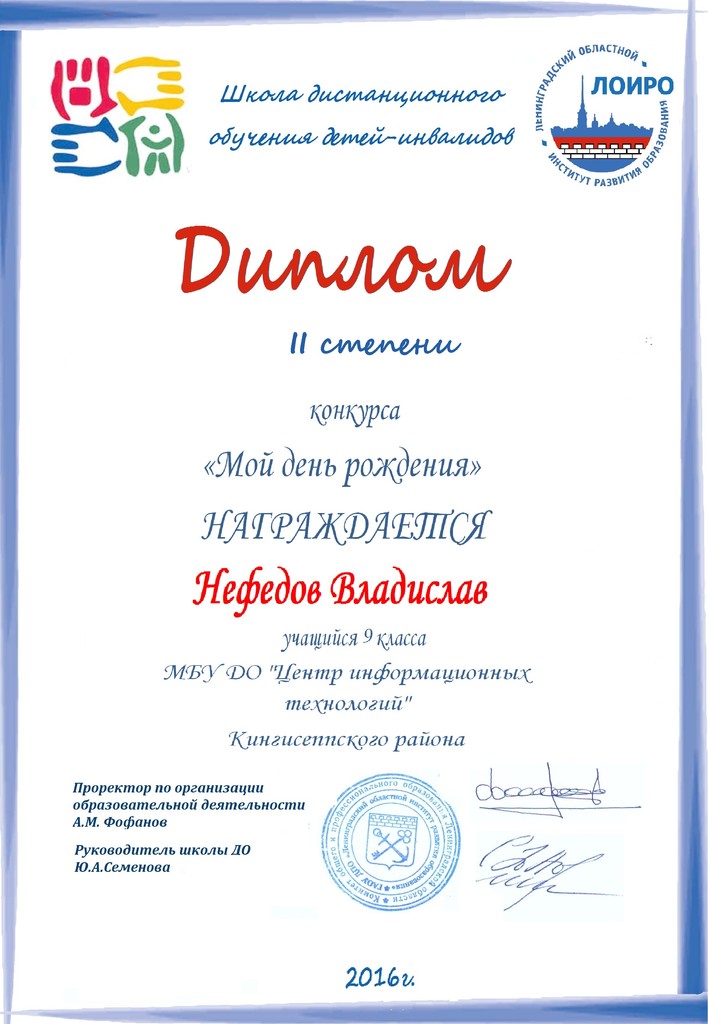 Подведены итоги пректа-конкурса «Мой день рождения», который проводил Ресурсный центр дистанционного обучения. Состязания проходили в дистанционной форме. От Кингисеппского Центра информационных технологий приняли участие 6 ребят.