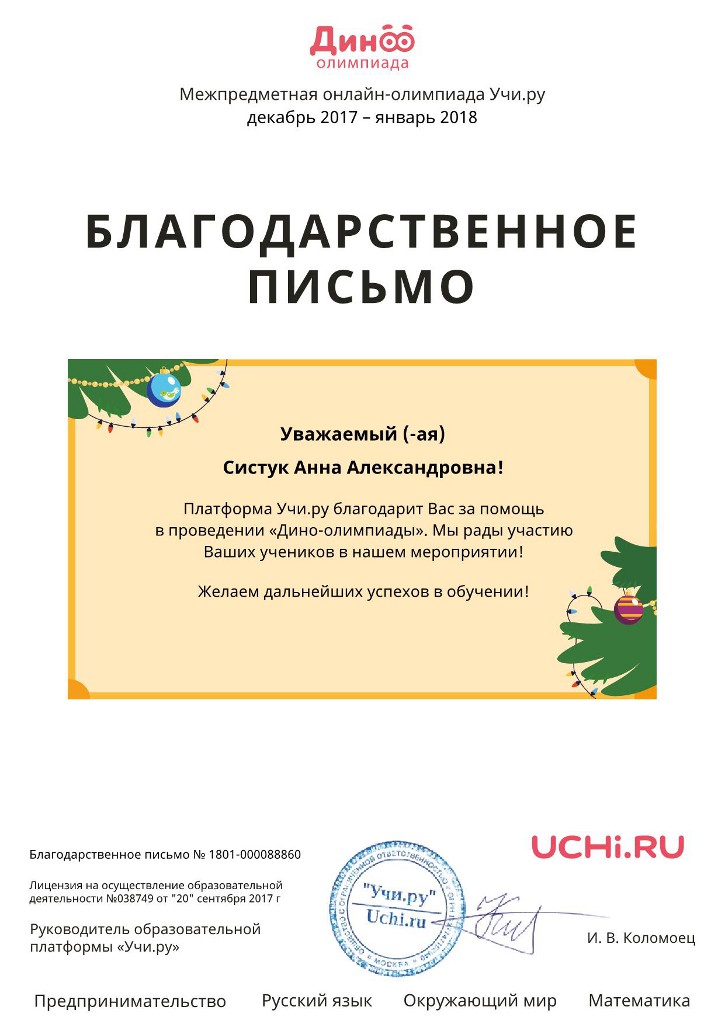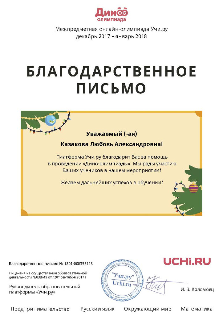 Также, Благодарственные письма вручены МБУ ДО «ЦИТ» и педагогам дополнительного образования Яковлевой Наталии Николаевне, Барбун Ольге Викторовне, Систук Анне Александровне, Казаковой Любови Александровне за помощь в проведении «Дино-олимпиады».