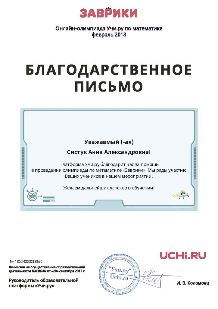 Также, Благодарственные письма вручены МБУ ДО «ЦИТ» и педагогам дополнительного образования Яковлевой Наталии Николаевне, Барбун Ольге Викторовне, Систук Анне Александровне, Казаковой Любови Александровне за помощь в проведении олимпиады по математике «Заврики».