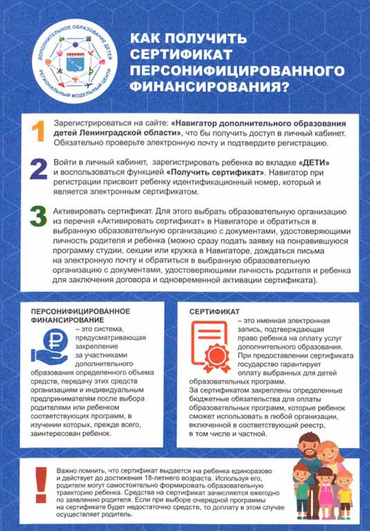 Сертификат — это именной электронный документ, который позволяет ребенку обучаться дополнительно, вне школы, за счет средств, выделенных государством. Все данные о Сертификате — срок действия, остаток средств на счете, списания — находятся на сайте Навигатора дополнительного образования https://р47.навигатор.дети/ в Личном кабинете пользователей.