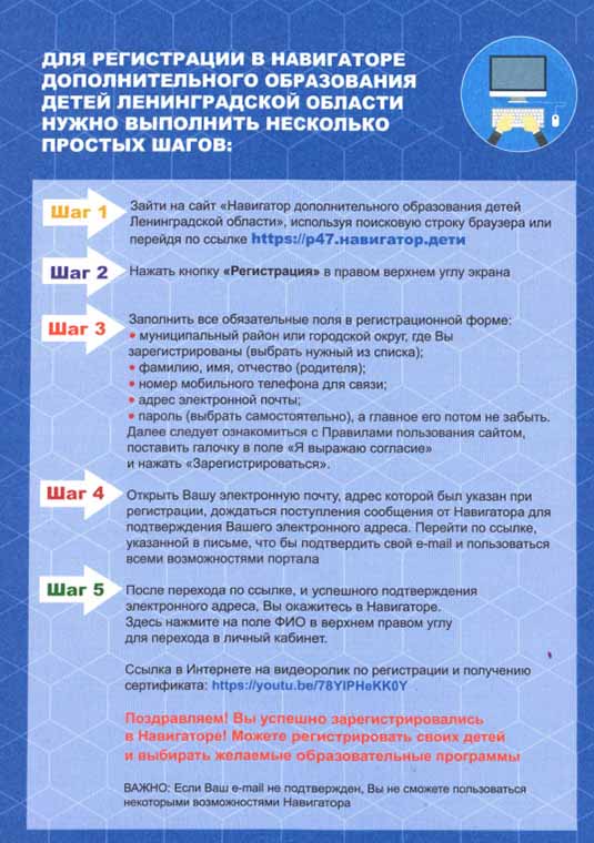 - Родители регистрируются на сайте Навигатора дополнительного образования https://р47.навигатор.дети/.